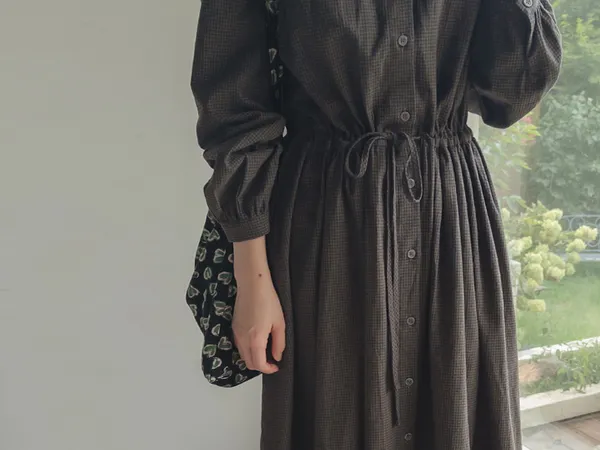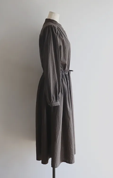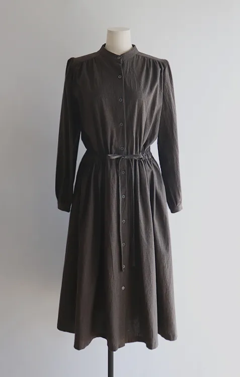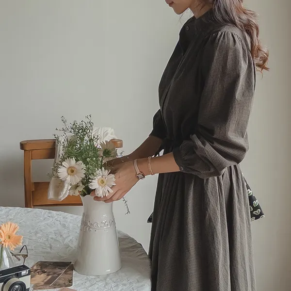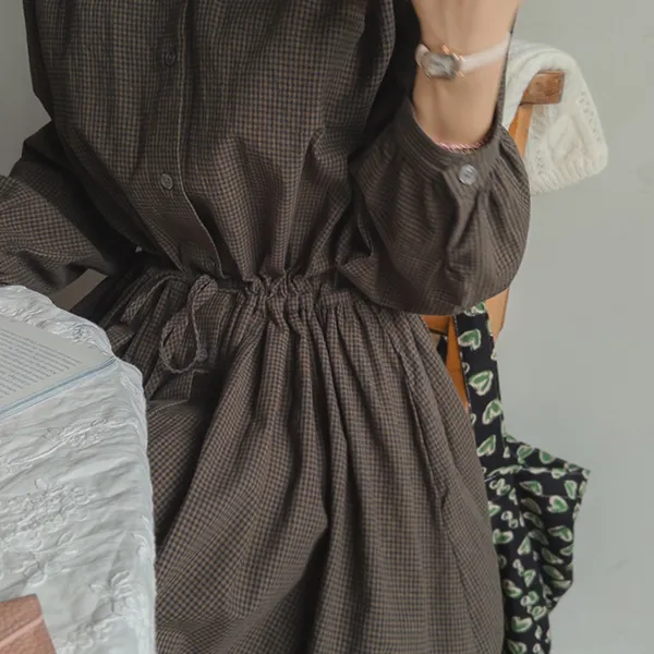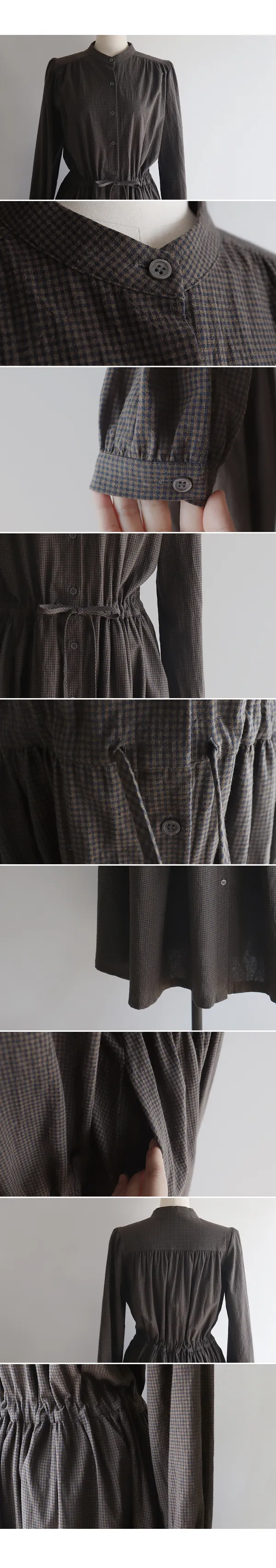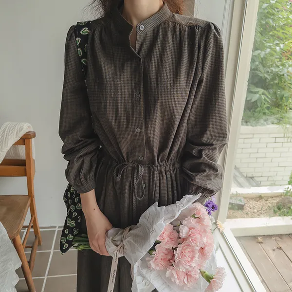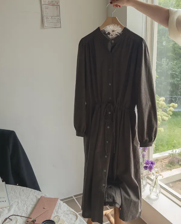 102601 立領小細格無印風長版洋裝