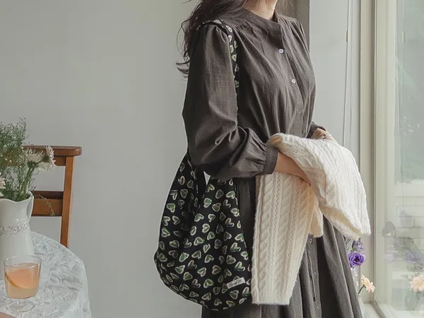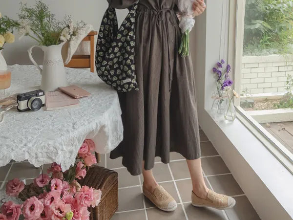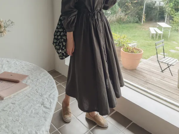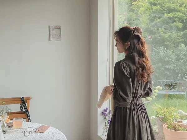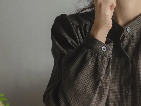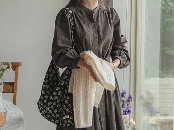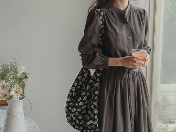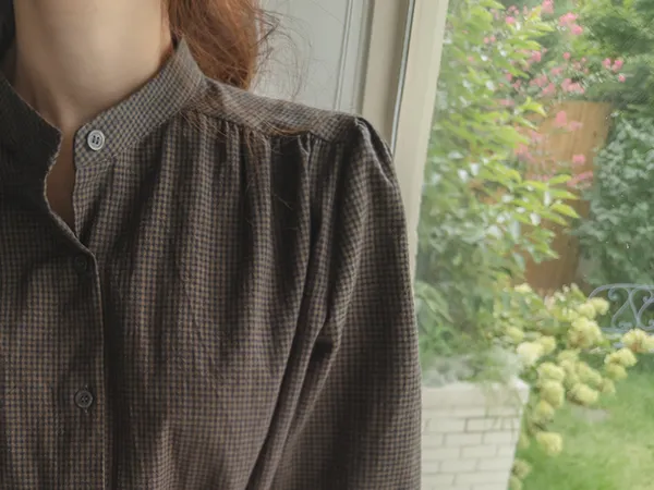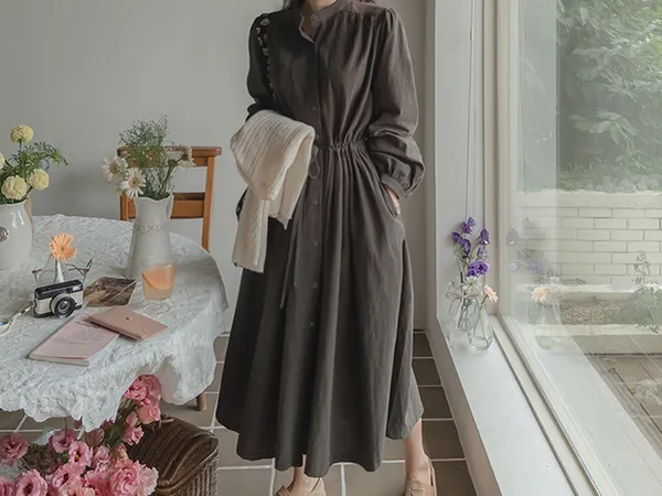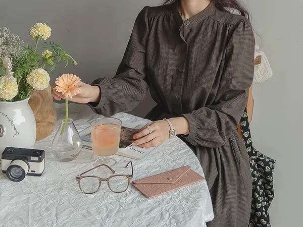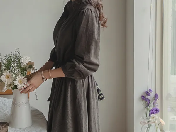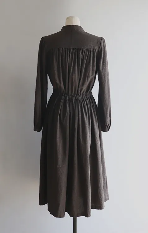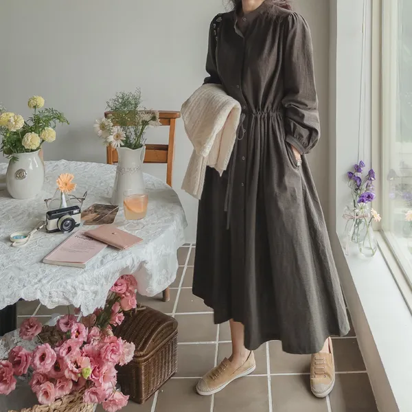 102601 立領小細格無印風長版洋裝