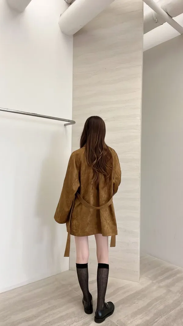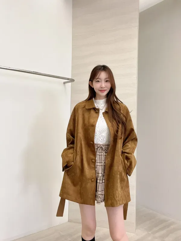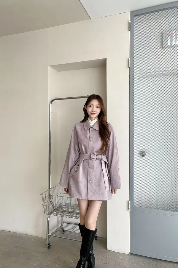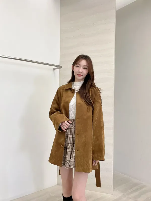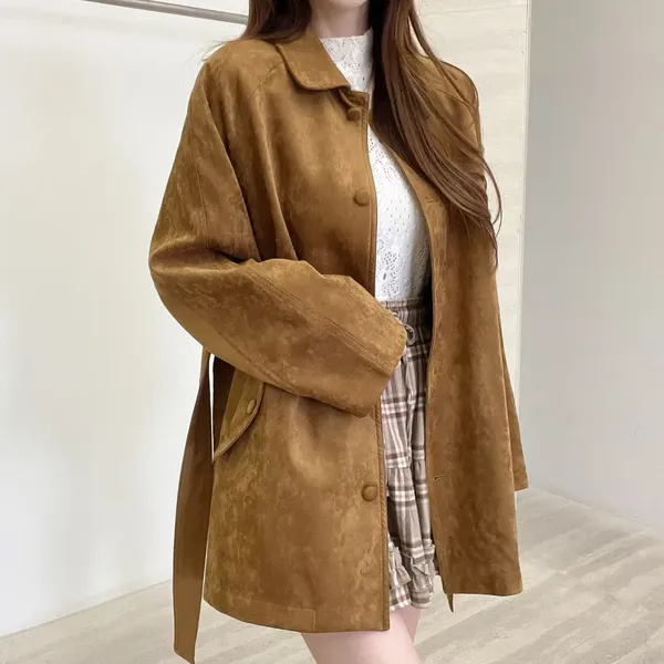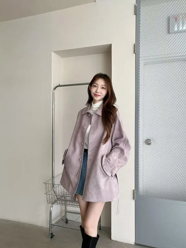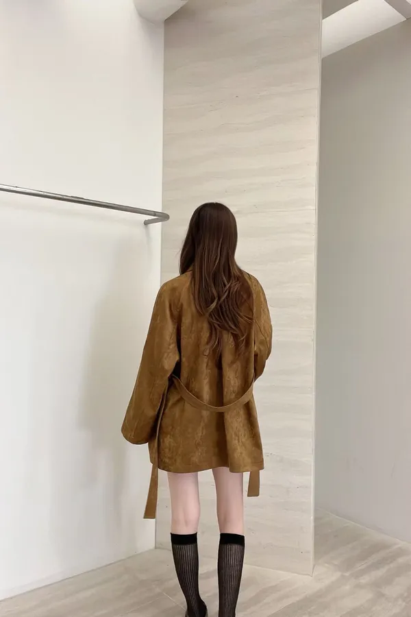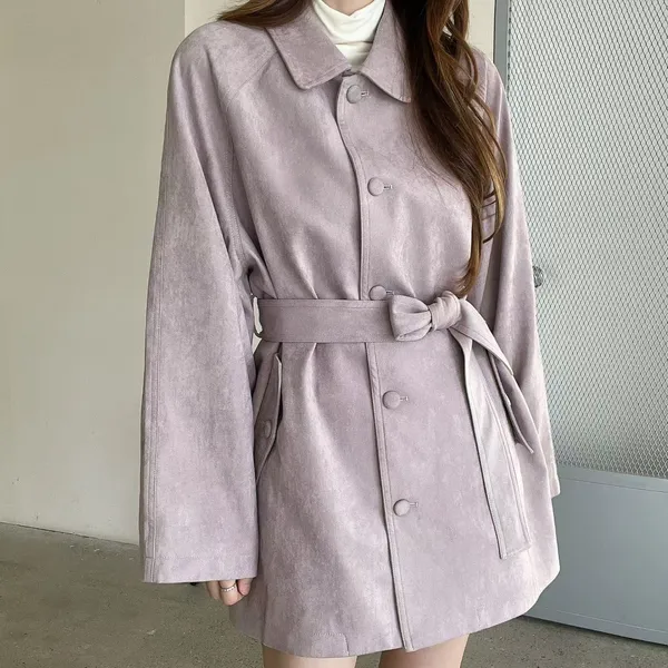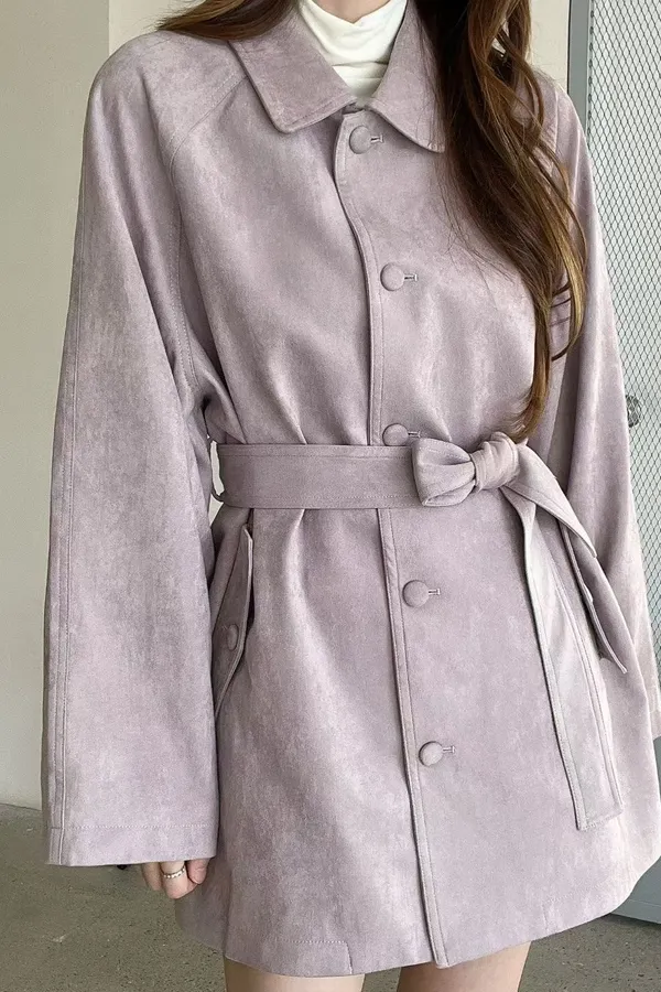 F06 麂皮綁帶中長版風衣外套