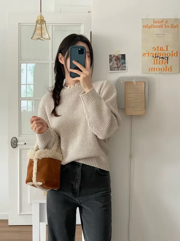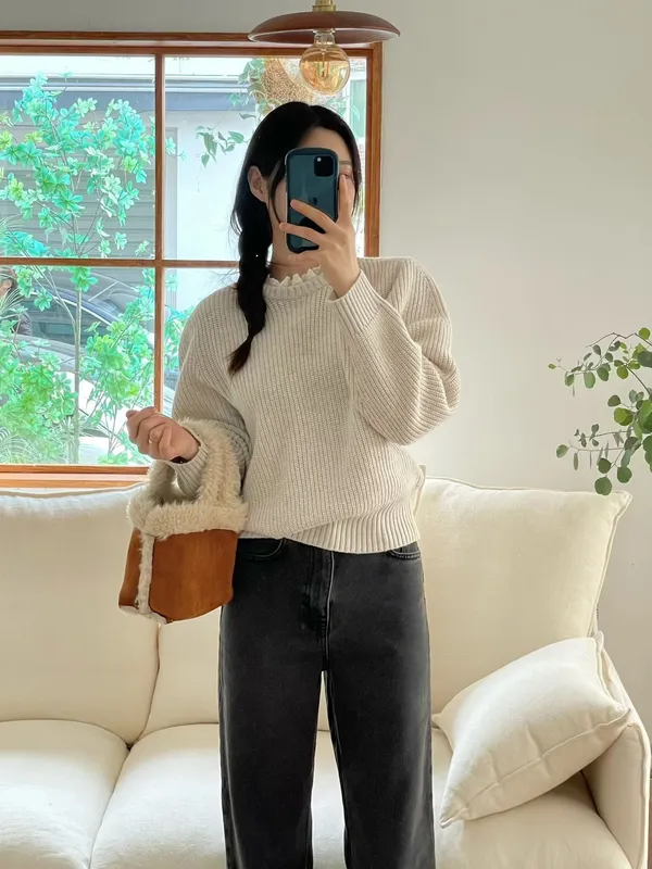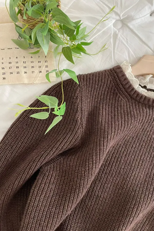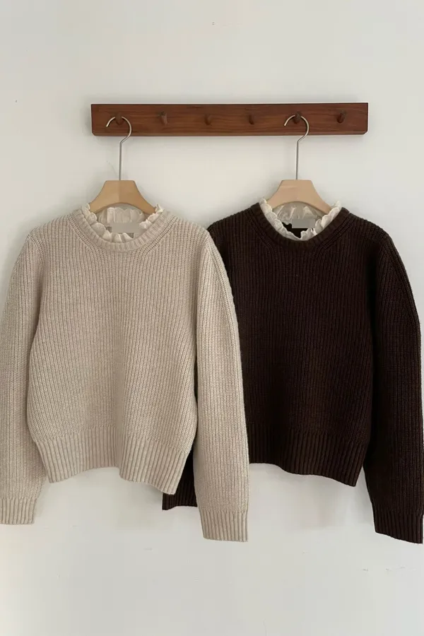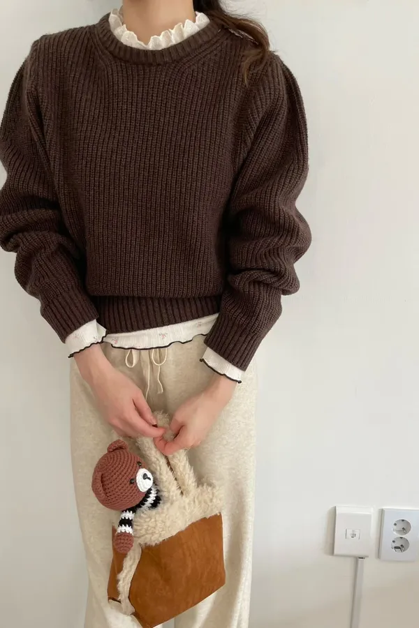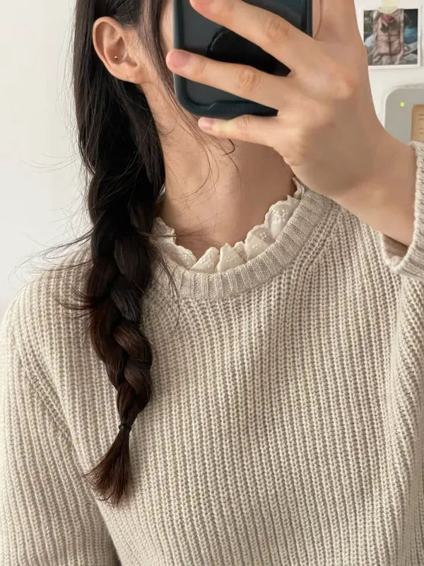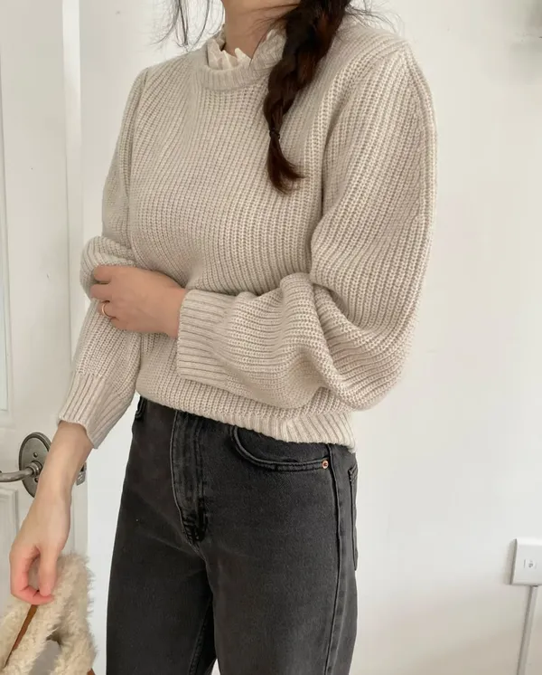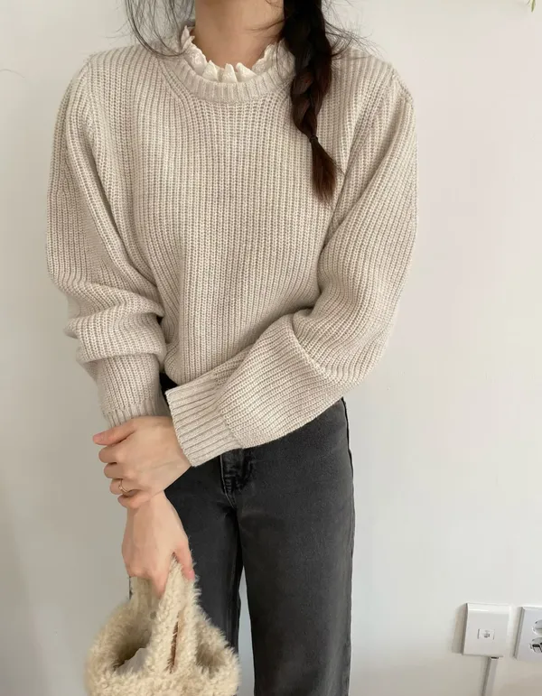 K08 坑條澎澎袖蕾絲假兩件上衣