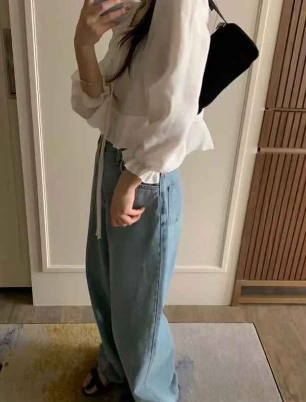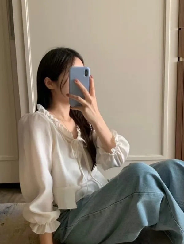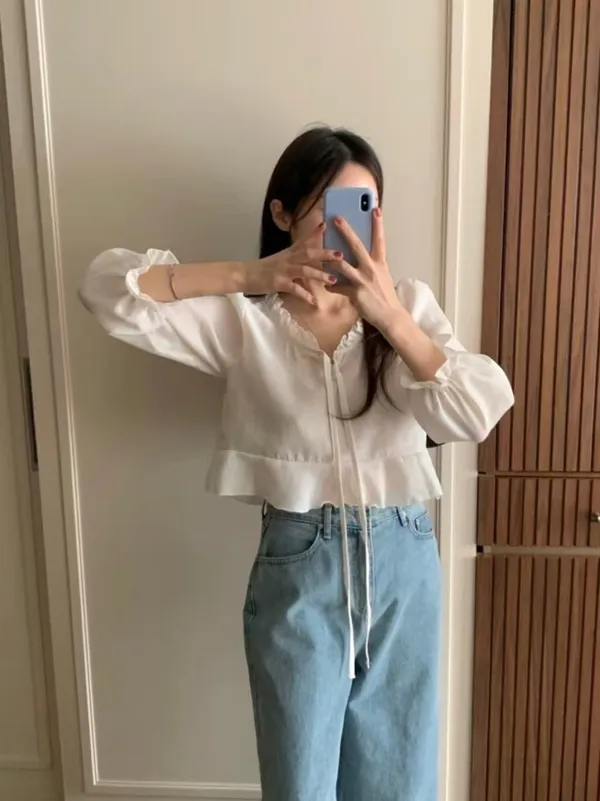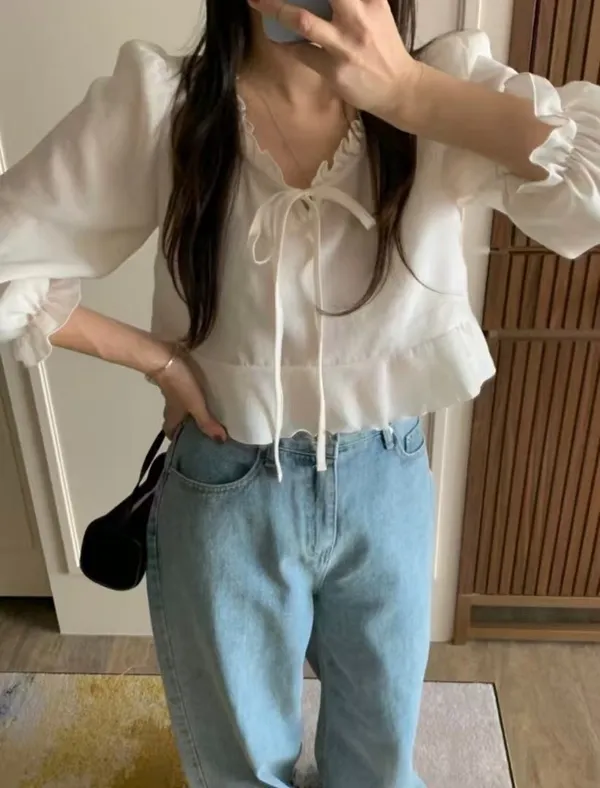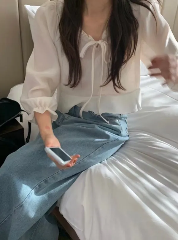 40805 大推! 領滾邊縮口袖綁帶上衣