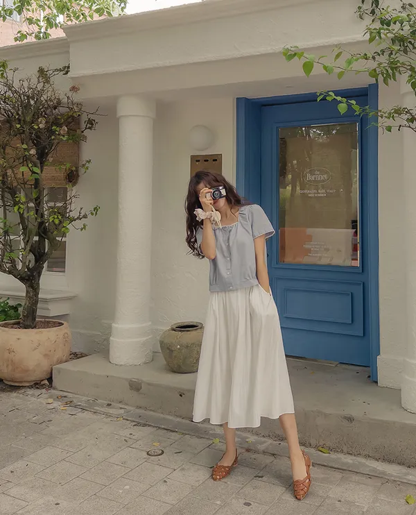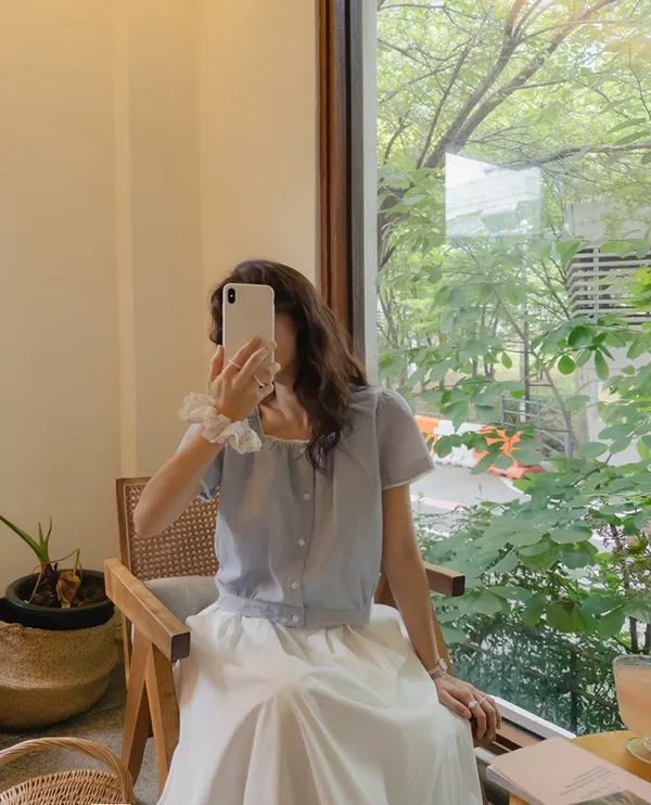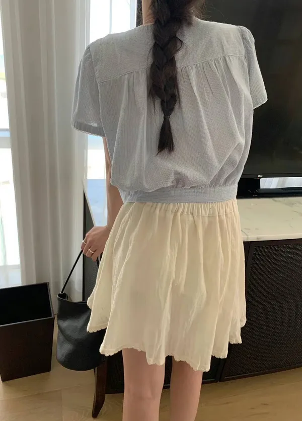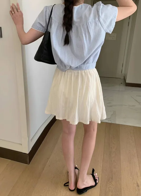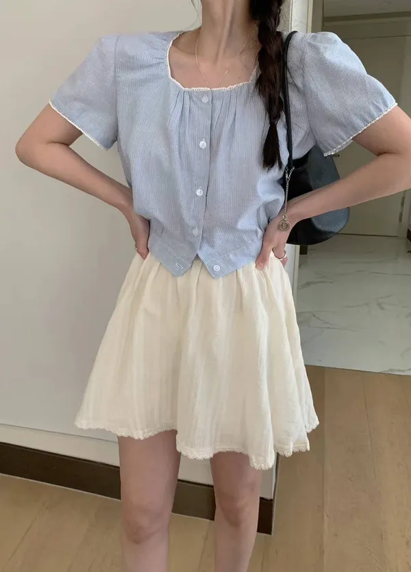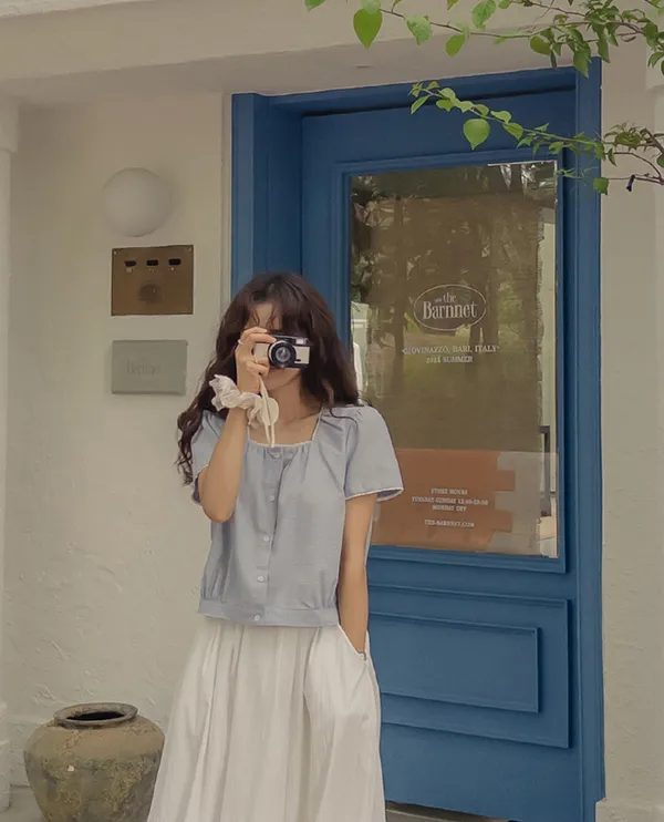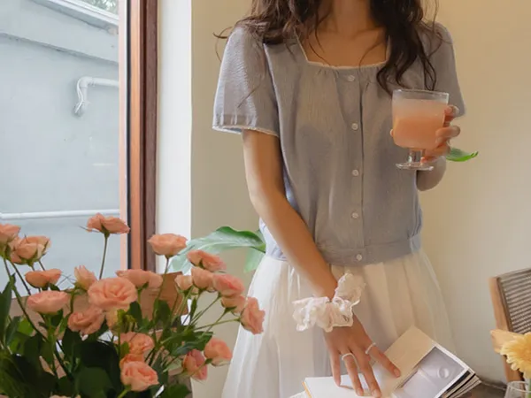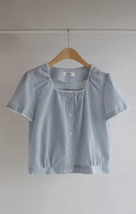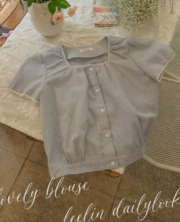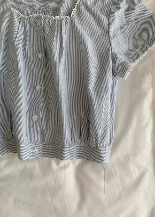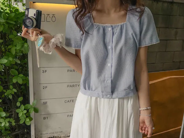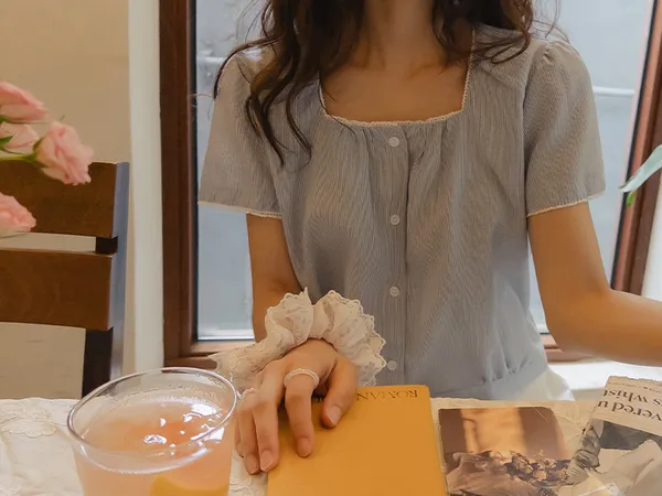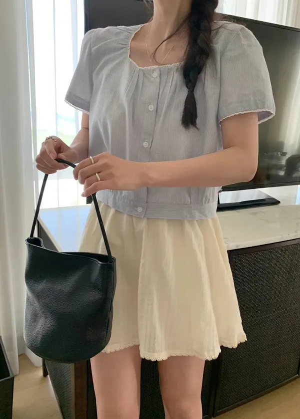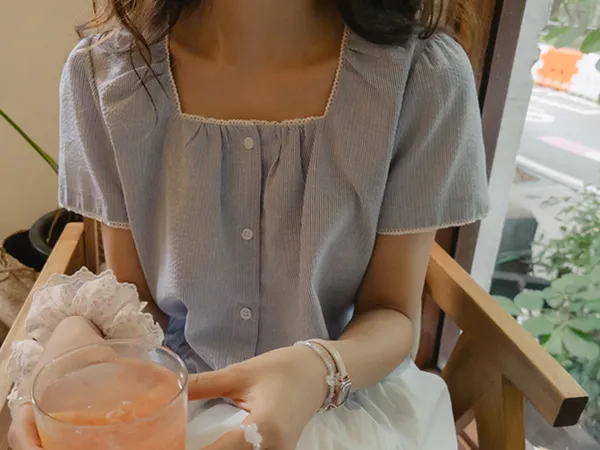 D02 配色 氣質文青 方領滾邊抓皺上衣