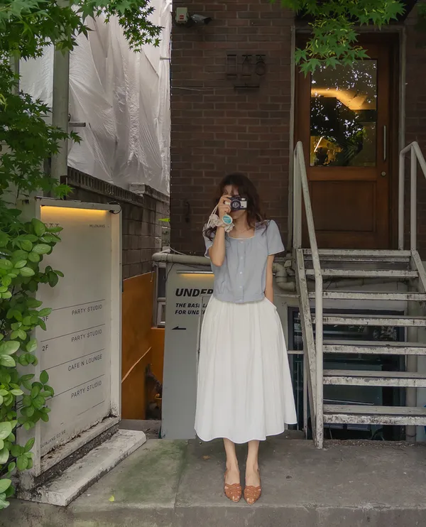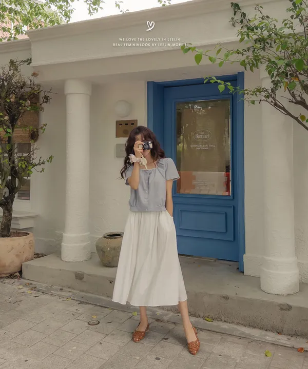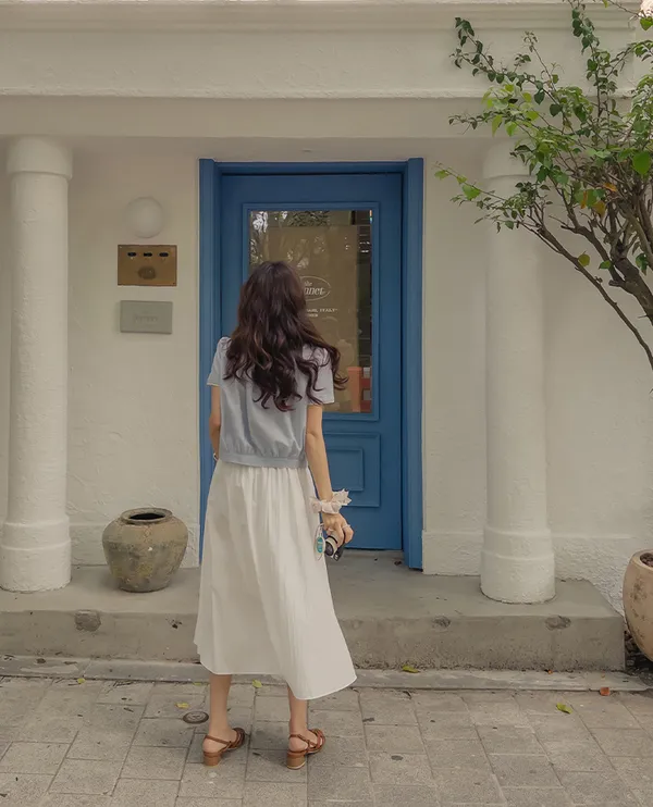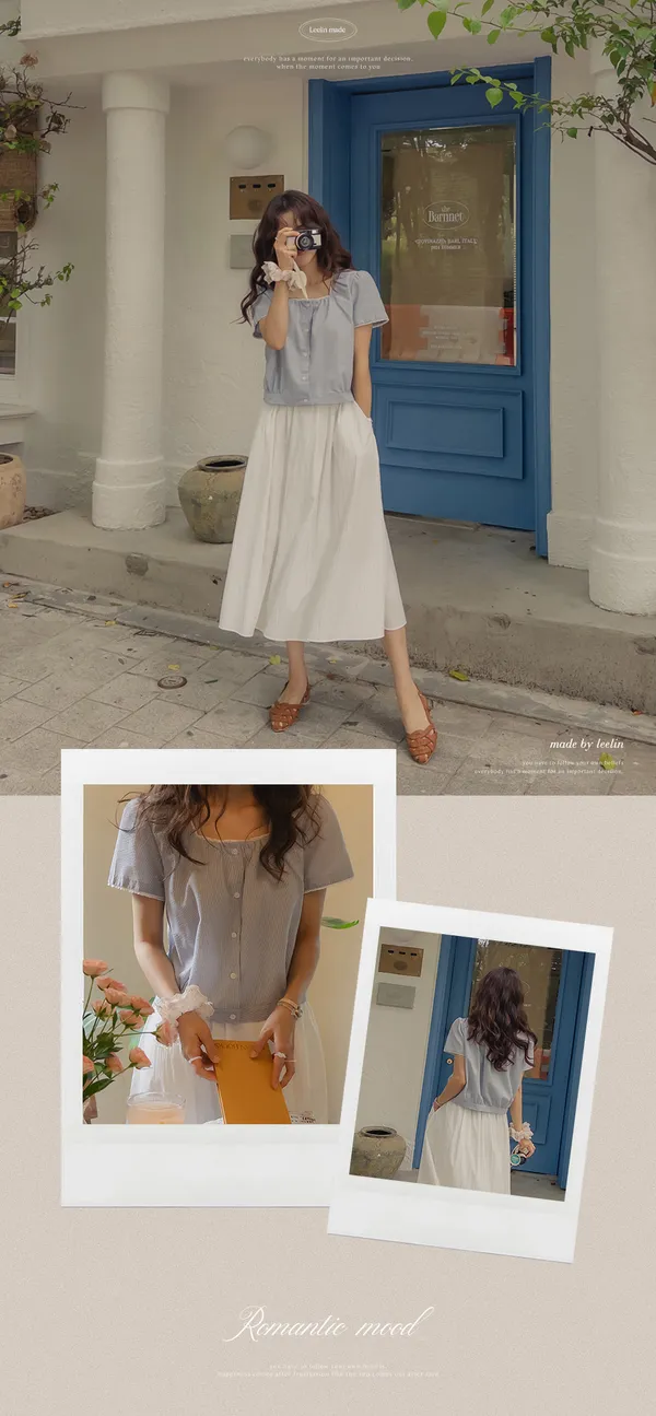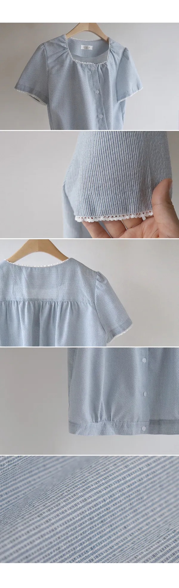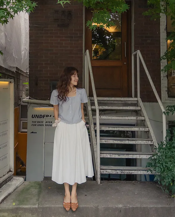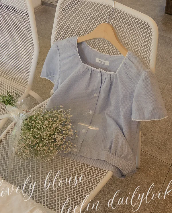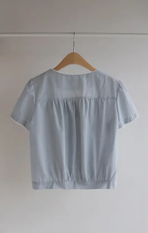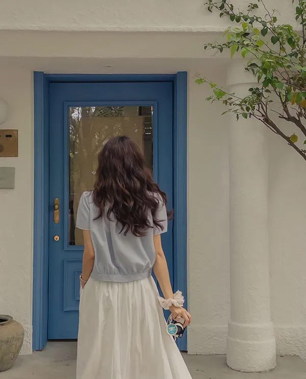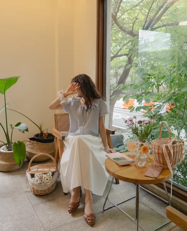D02 配色 氣質文青 方領滾邊抓皺上衣