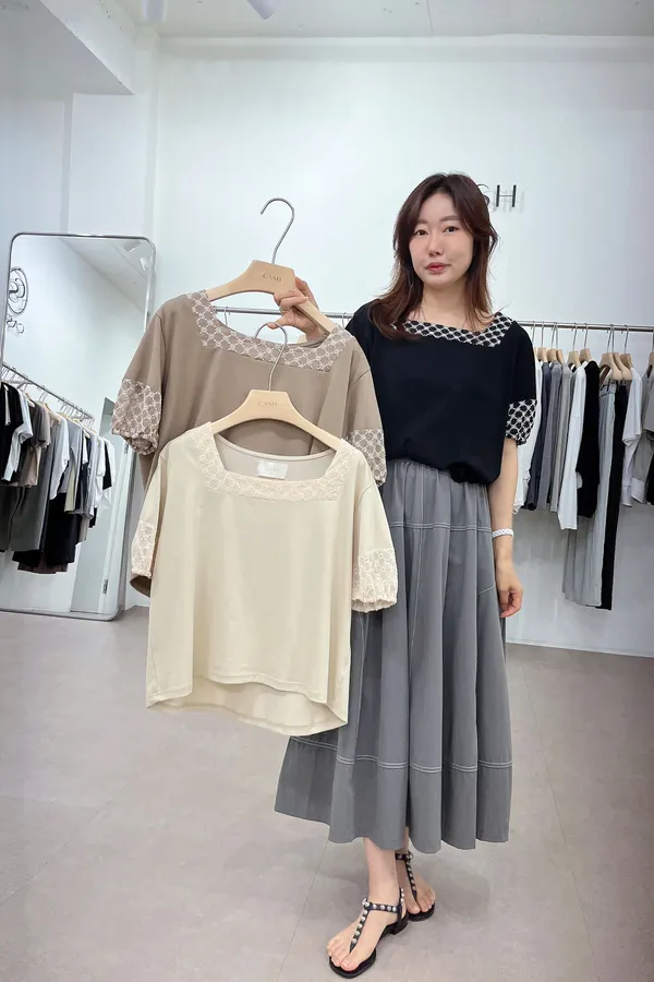C04 配色 蕾絲燒花ㄇ字領上衣