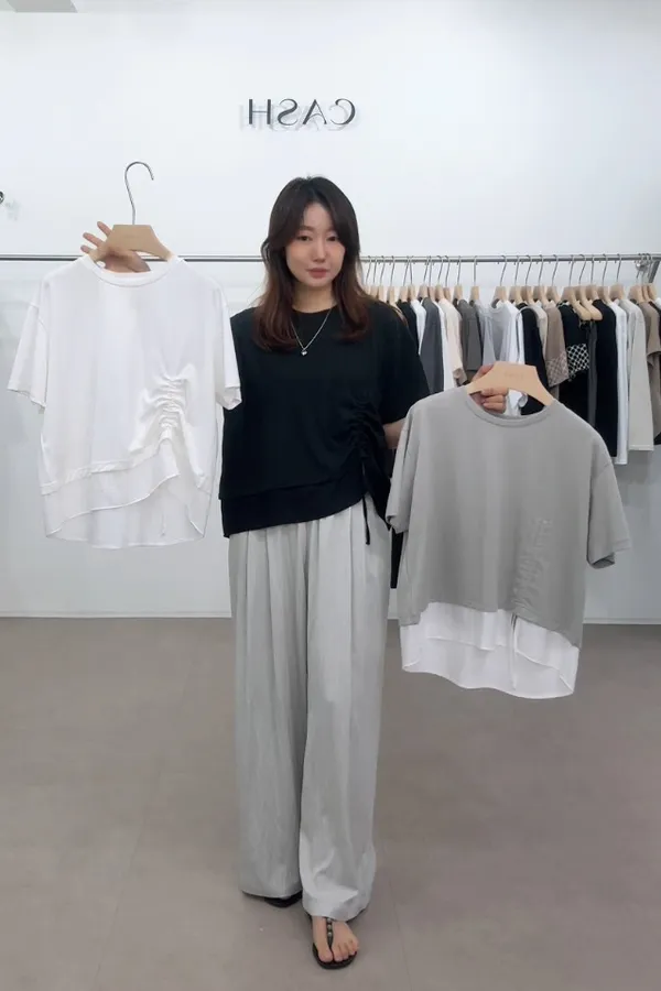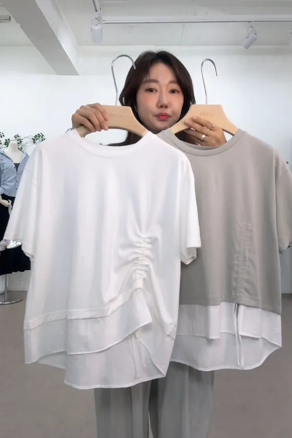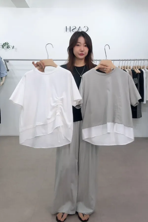 C16 抽繩設計 拼接假兩件上衣